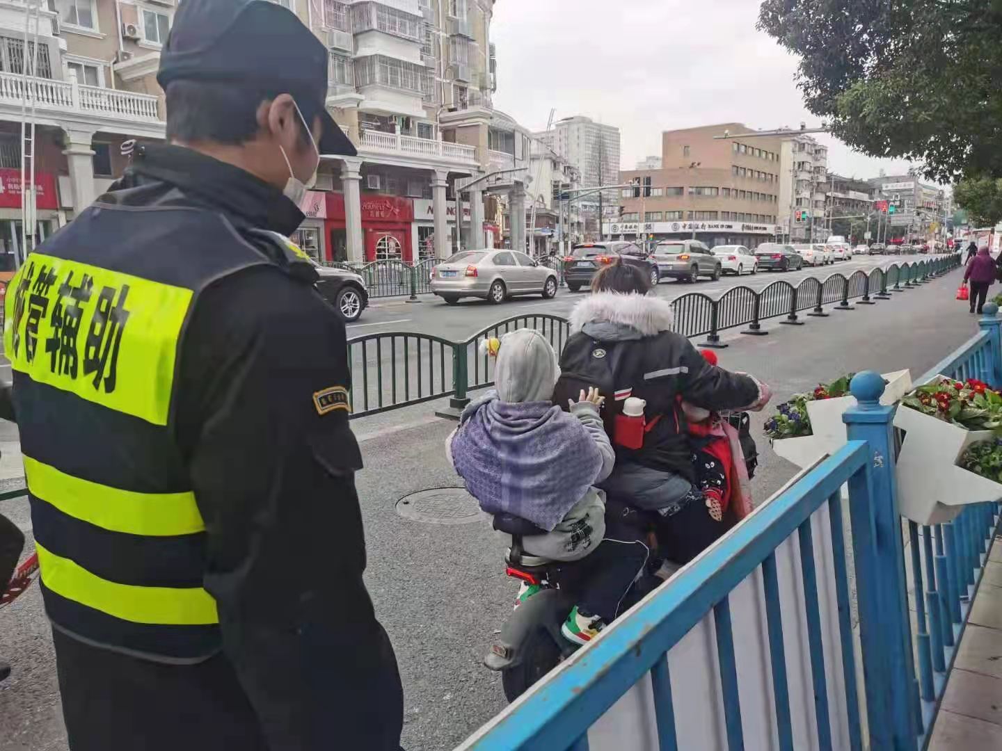 1月5日,宗保公司駐周浦市容機動(dòng)組隊員鄒學(xué)峰幫助走散女童找到家人。