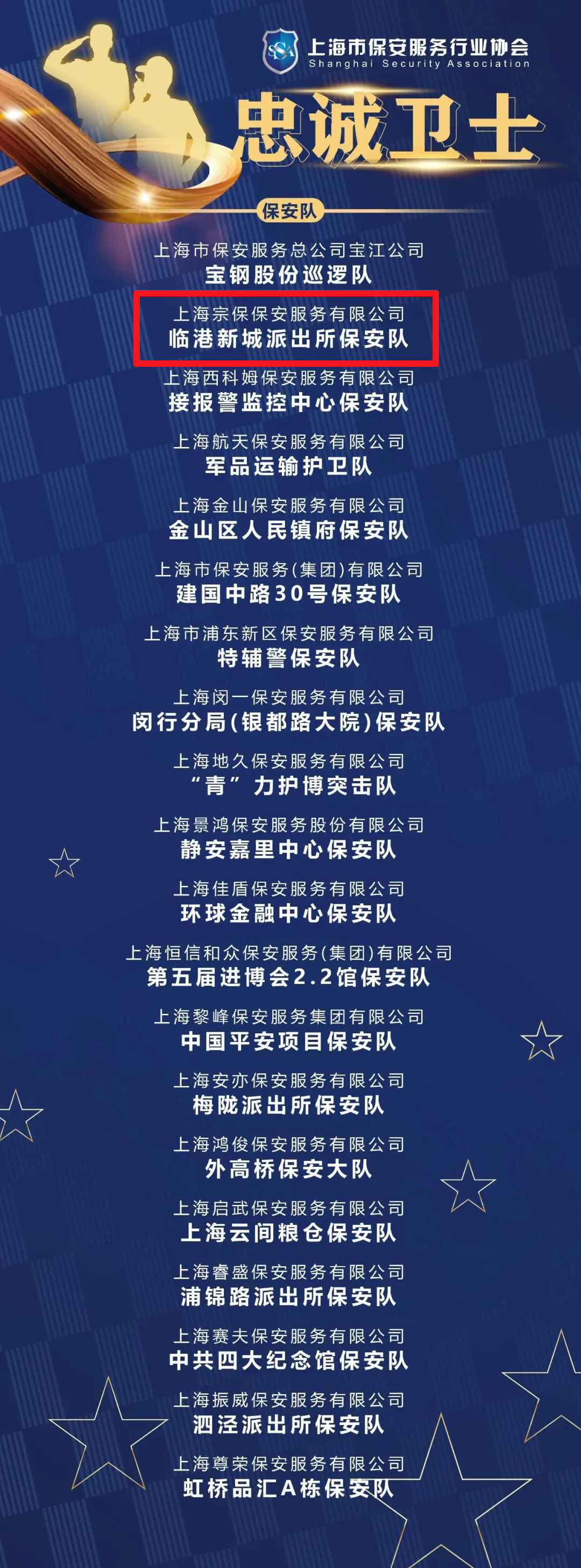 1月17日,上海市保安服務(wù)行業(yè)協(xié)會(huì )公布了“忠誠衛士”評選結果,宗保公司1個(gè)保安隊和1名員工分獲殊榮。