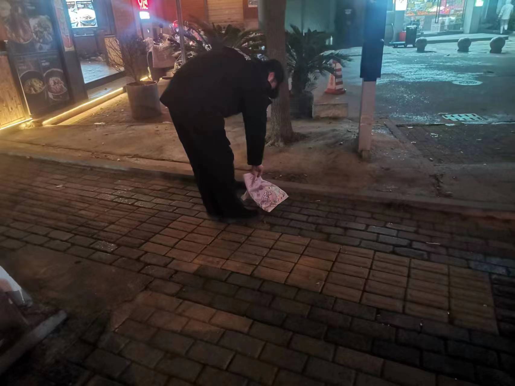 大約過(guò)了30分鐘,一位身穿黑衣的男子返回現場(chǎng)尋找。王旗核實(shí)確認其是失主后,就將手提袋交還給了該男子。男子十分高興連連表示感謝,執意拿出現金給王旗買(mǎi)奶茶,被王旗婉言謝絕了。