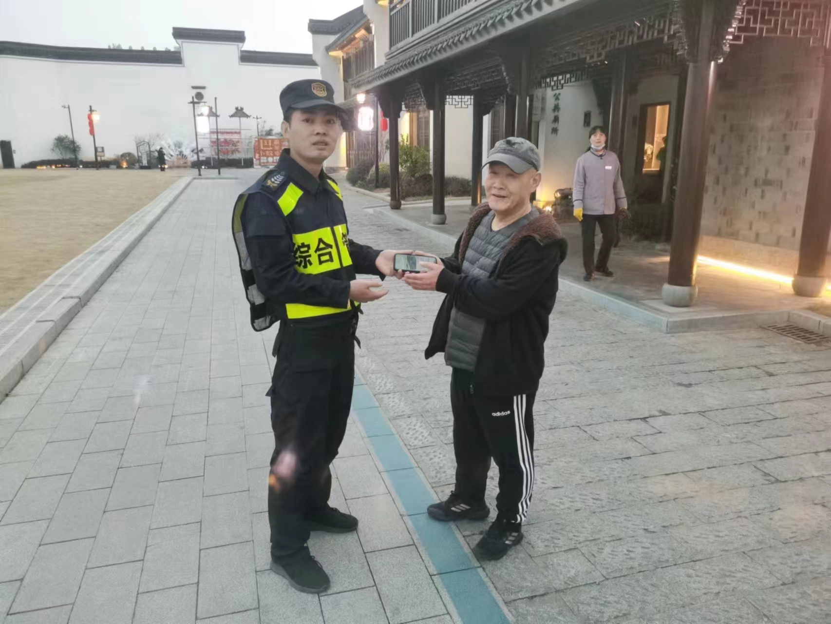 當日16:15,公司員工況潔在閑林老街大草坪值勤時(shí),在公共廁所洗漱臺上撿到一部黑色的蘋(píng)果12。因手機設有鎖屏密碼,無(wú)法聯(lián)系失主,況潔便將情況報告了組長(cháng),并按指示在附近邊值勤邊等待失主。