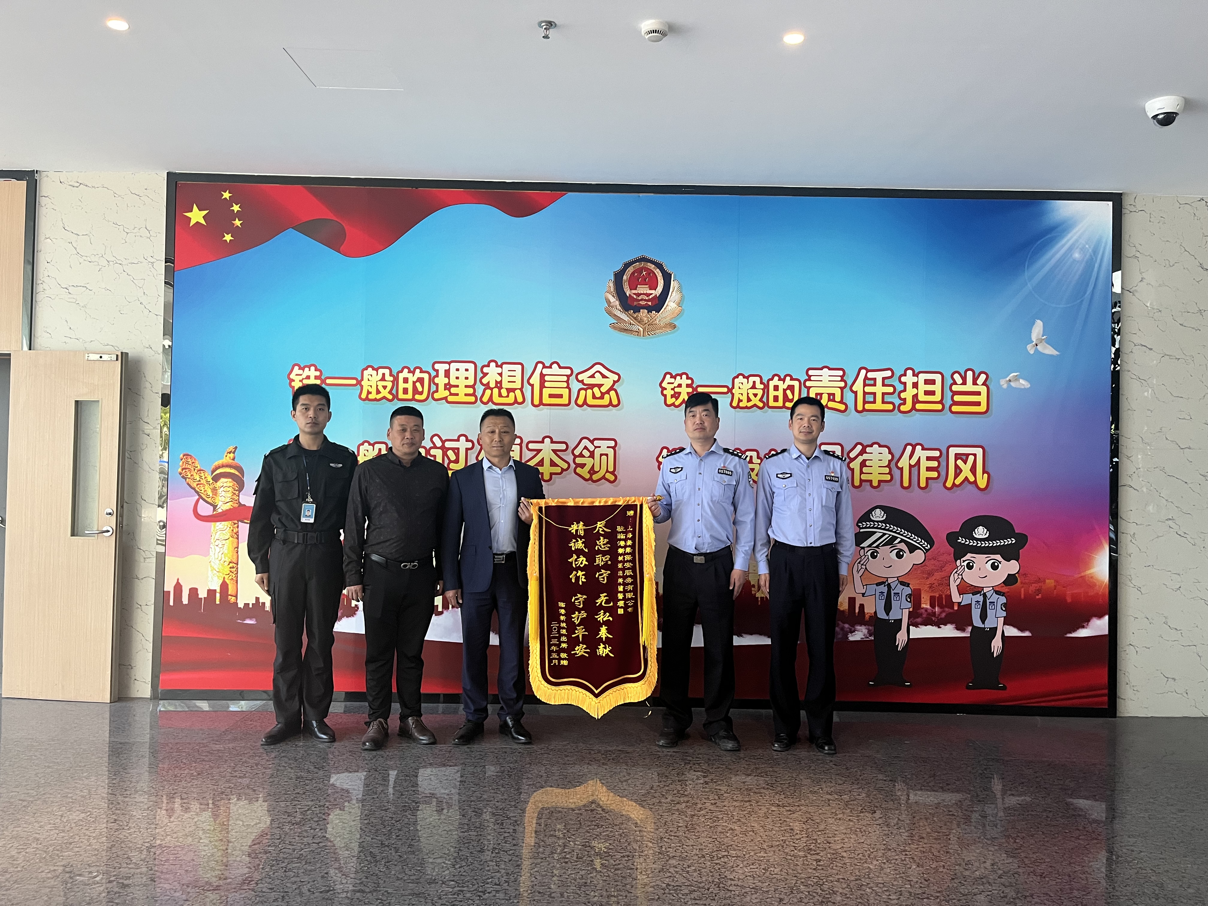 5月9日,浦東公安分局臨港新城派出所副所長(cháng)施軍杰將一面繡有“盡忠職守 無(wú)私奉獻,精誠協(xié)作 守護平安”的錦旗和一封感謝信贈送宗保公司駐該所輔助項目,感謝公司對派出所工作的大力支持。