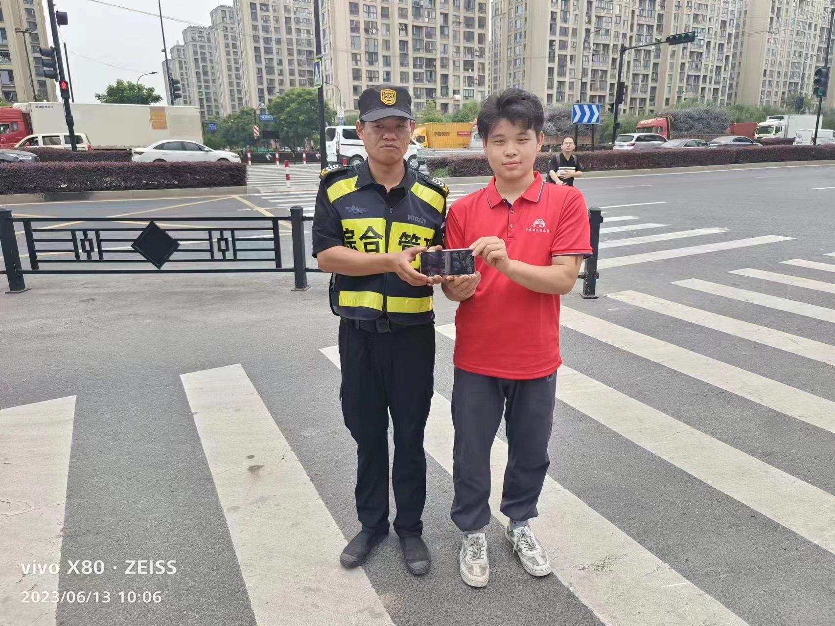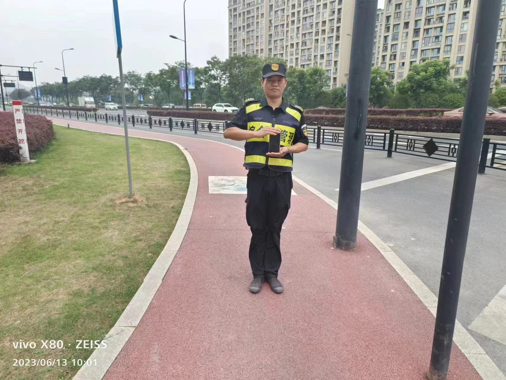 6月25日,宗保公司駐浦東新區周浦市容項目員工布廷貴在康新公路周祝公路路口值勤時(shí),撿到一部蘋(píng)果14手機。布廷貴在原地等候20多分鐘后,將手機交還給女失主,受到失主的感謝。