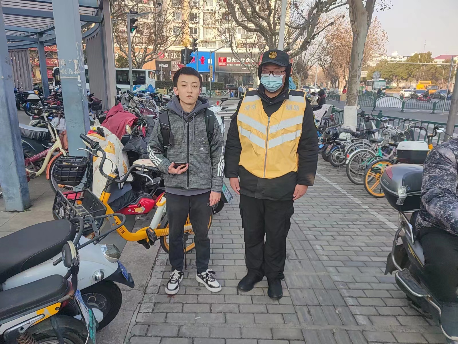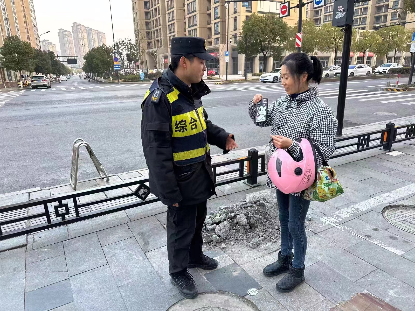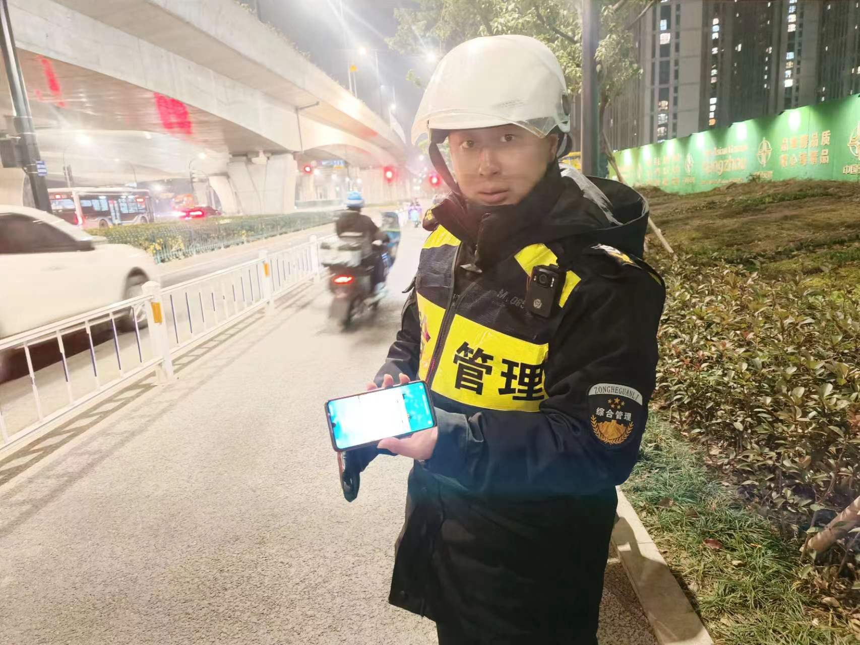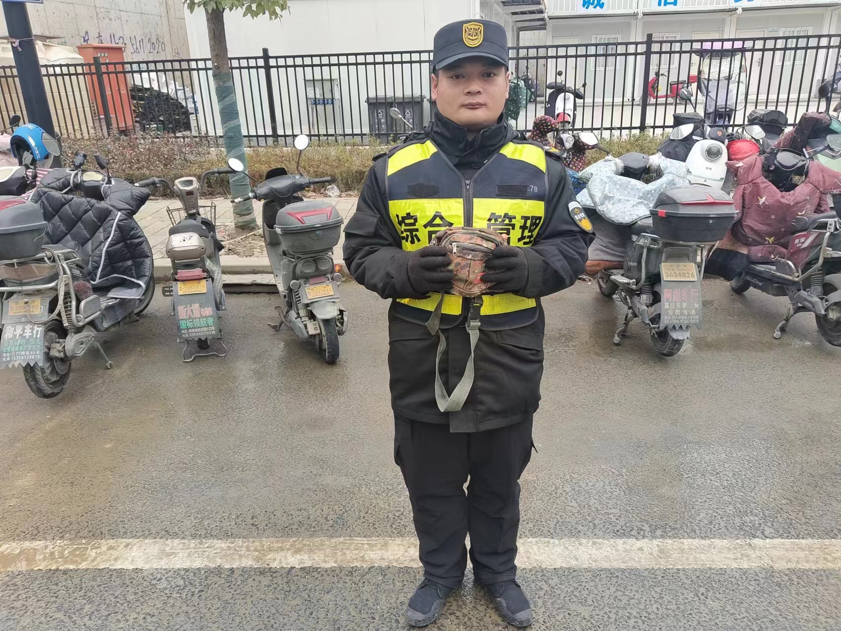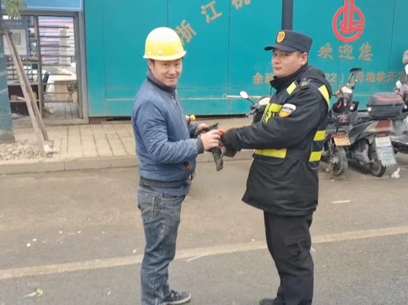 1月8日11:00,浙江民泰公司駐杭州市余杭區閑林城管輔助項目員工明宗梁和楊顯峰在民聚福路杭州灣工地門(mén)口協(xié)助甲方開(kāi)展無(wú)證攤販管理時(shí),撿到一個(gè)挎包,內有一部手機、一張身份證和一副耳機。明宗梁隨即詢(xún)問(wèn)周?chē)と?,是否有人丟挎包,結果無(wú)人認領(lǐng)。楊顯峰就將情況報告了隊長(cháng),并按指示在原地等待。大約過(guò)了10幾分鐘,一名男子急匆匆地趕到現場(chǎng),詢(xún)問(wèn)是否看到一只挎包。明宗梁仔細向男子核對了包內物品,確認其是失主后,便把挎包交還給了他。男子拿著(zhù)挎包,再三向員工明宗梁和楊顯峰道謝。