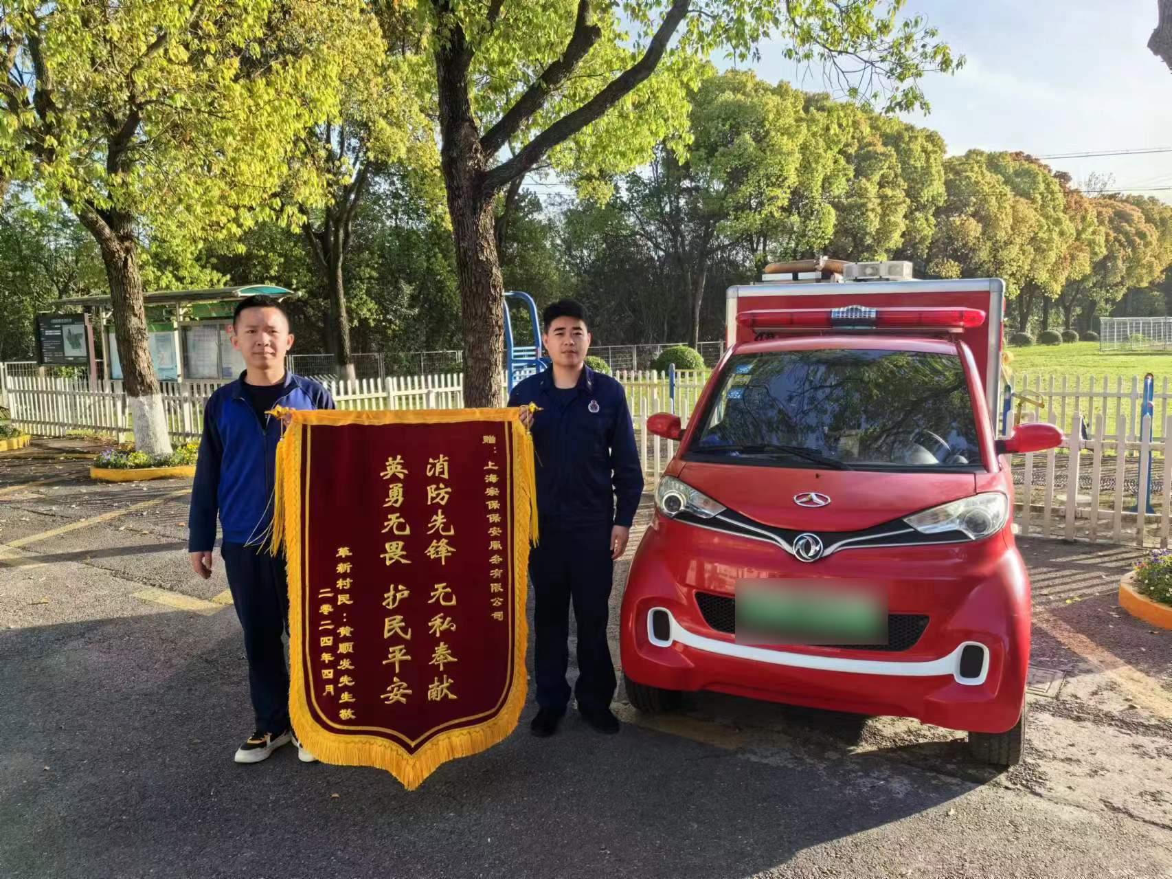 4月19日,宗保公司駐浦東新區高東鎮欣連苑社區微型消防站收到市民黃先生贈送的一面繡有“消防先鋒 無(wú)私奉獻 英勇無(wú)畏 護民平安”的錦旗,感謝宗保員工幫其撲滅家中火情的英勇行為。
