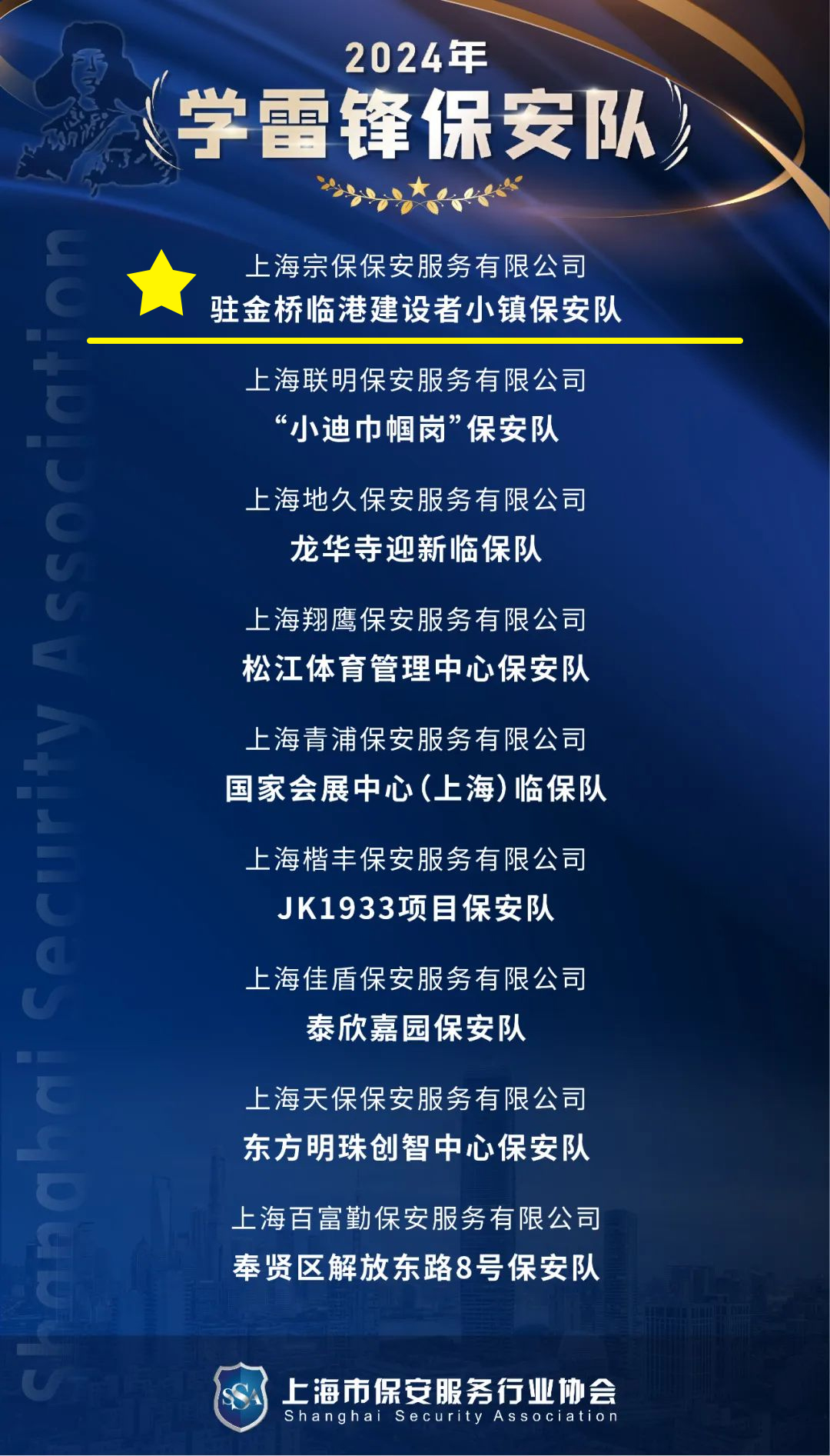 近日,上海市保安服務(wù)行業(yè)協(xié)會(huì )公布了“學(xué)雷鋒保安隊”“學(xué)雷鋒保安員”“巾幗保安員”評選結果,宗保公司1個(gè)項目隊和3名員工分獲殊榮。