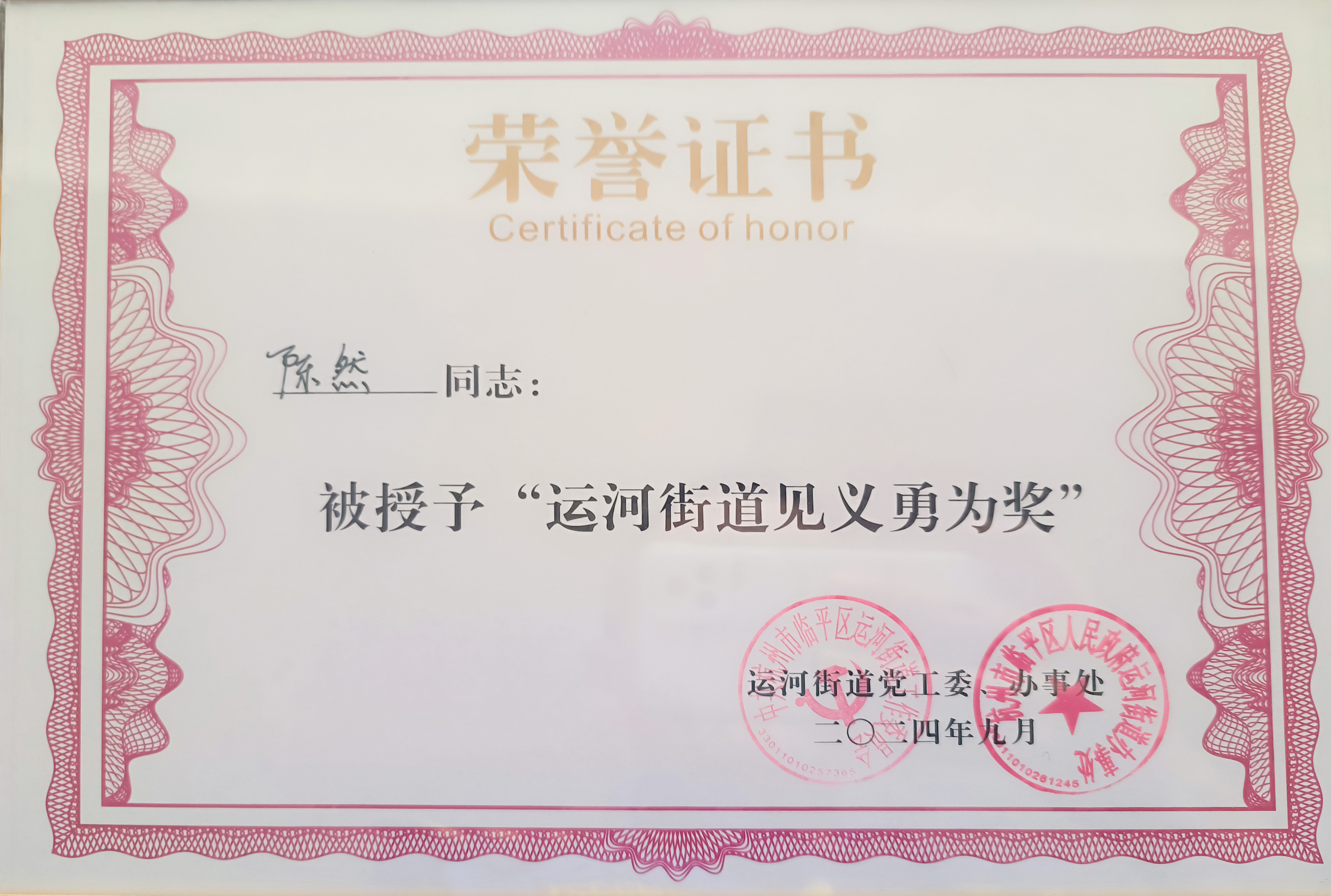 9月14日,浙江民泰公司駐杭州市臨平區運河市容項目3名員工被運河街道黨工委、辦事處授予“運河街道見(jiàn)義勇為獎”。