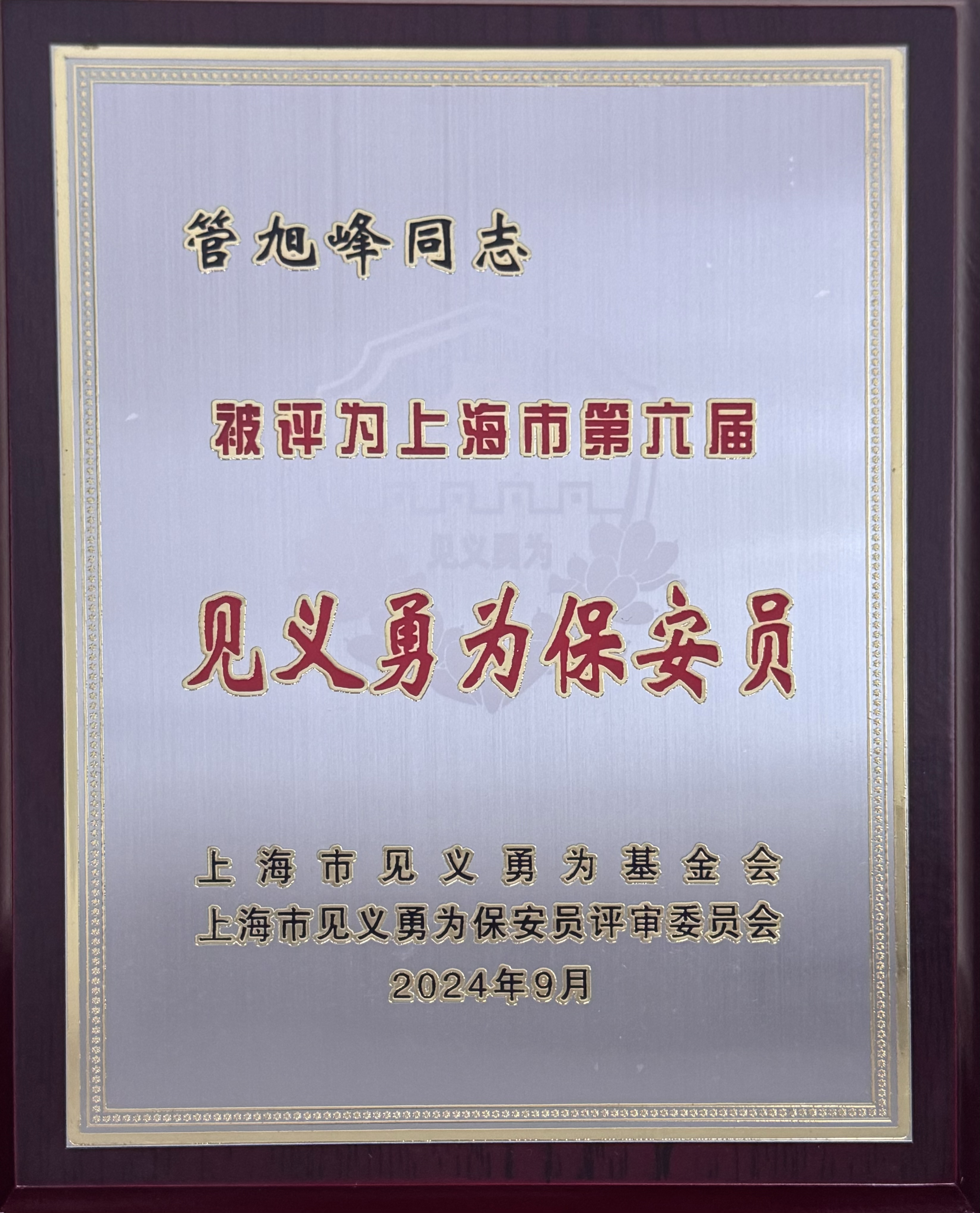 2024年9月27日,上海市見(jiàn)義勇為基金會(huì )在上海市司法局三樓會(huì )議室召開(kāi)2024年二三季度見(jiàn)義勇為先進(jìn)評選表彰發(fā)布會(huì )。會(huì )上,上海宗保保安服務(wù)有限公司員工管旭峰、凌邵凱、吳寶和鄧江峰被評為上海市第六屆“見(jiàn)義勇為保安員”。