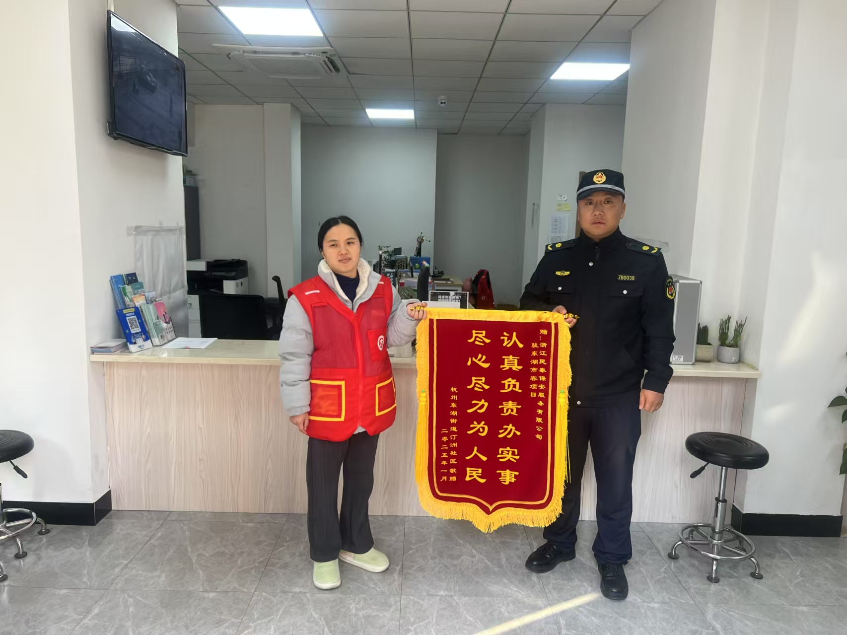1月6日,浙江民泰公司駐杭州市臨平區東湖市容項目收到朱家角社區贈送的一面繡有“樂(lè )于助人 盡職盡責”的錦旗,感謝公司員工在助力社區開(kāi)展的街面流動(dòng)攤點(diǎn)占道經(jīng)營(yíng)、沿街商鋪跨店經(jīng)營(yíng)整治活動(dòng)中作出的積極貢獻。