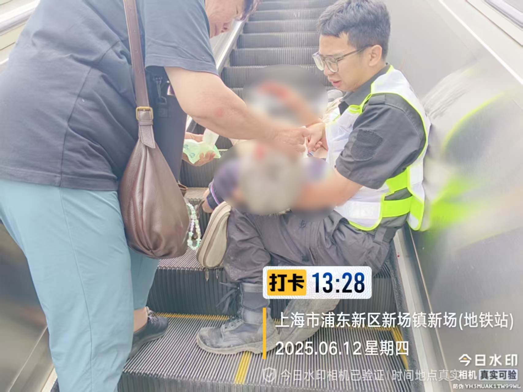 當日13:25,正在16號線(xiàn)新場(chǎng)地鐵站2號口附近巡邏的公司員工翟佳明,突然聽(tīng)到一陣急促的喊叫聲,來(lái)不及多想的他便立即循聲跑去。