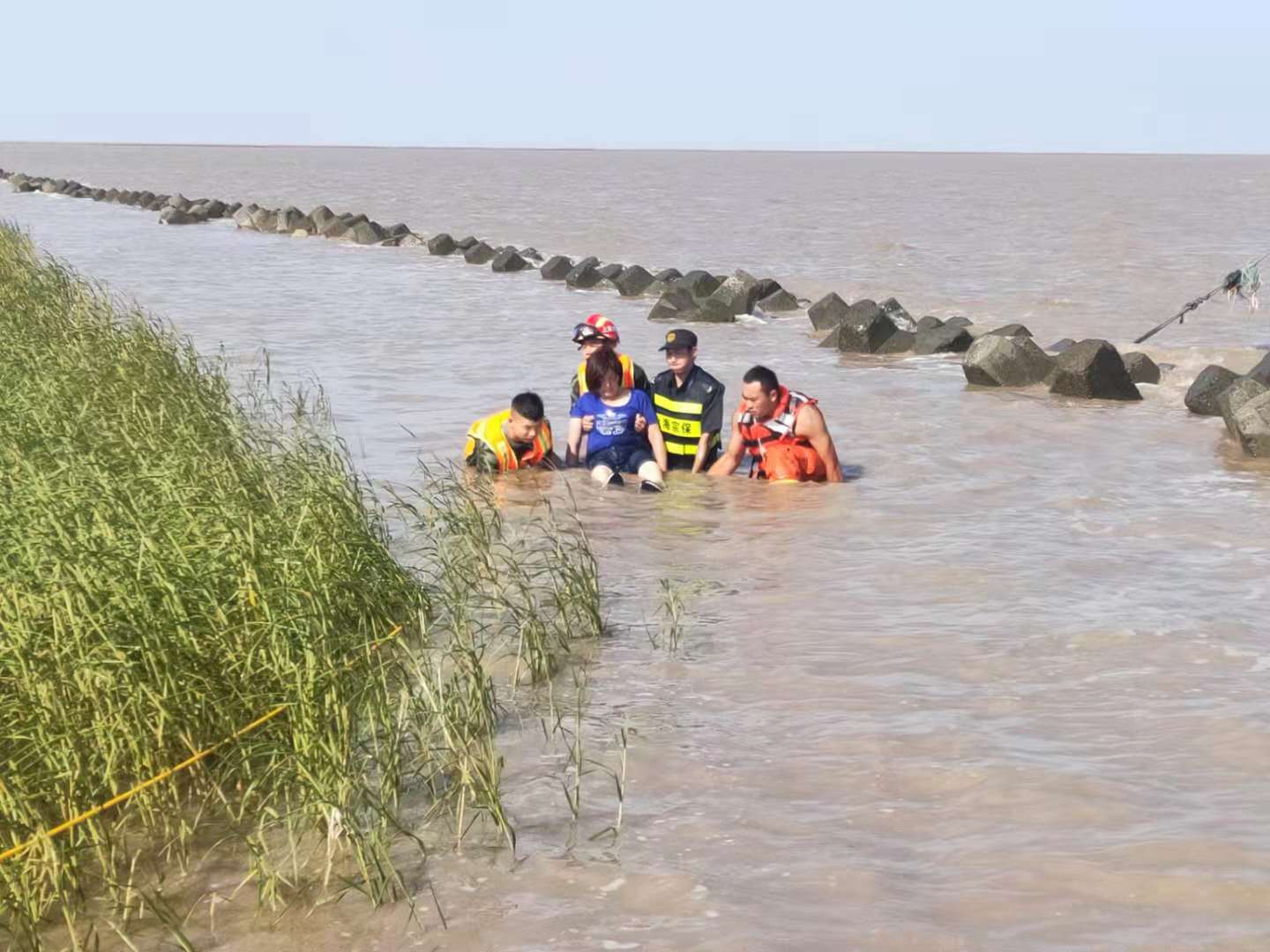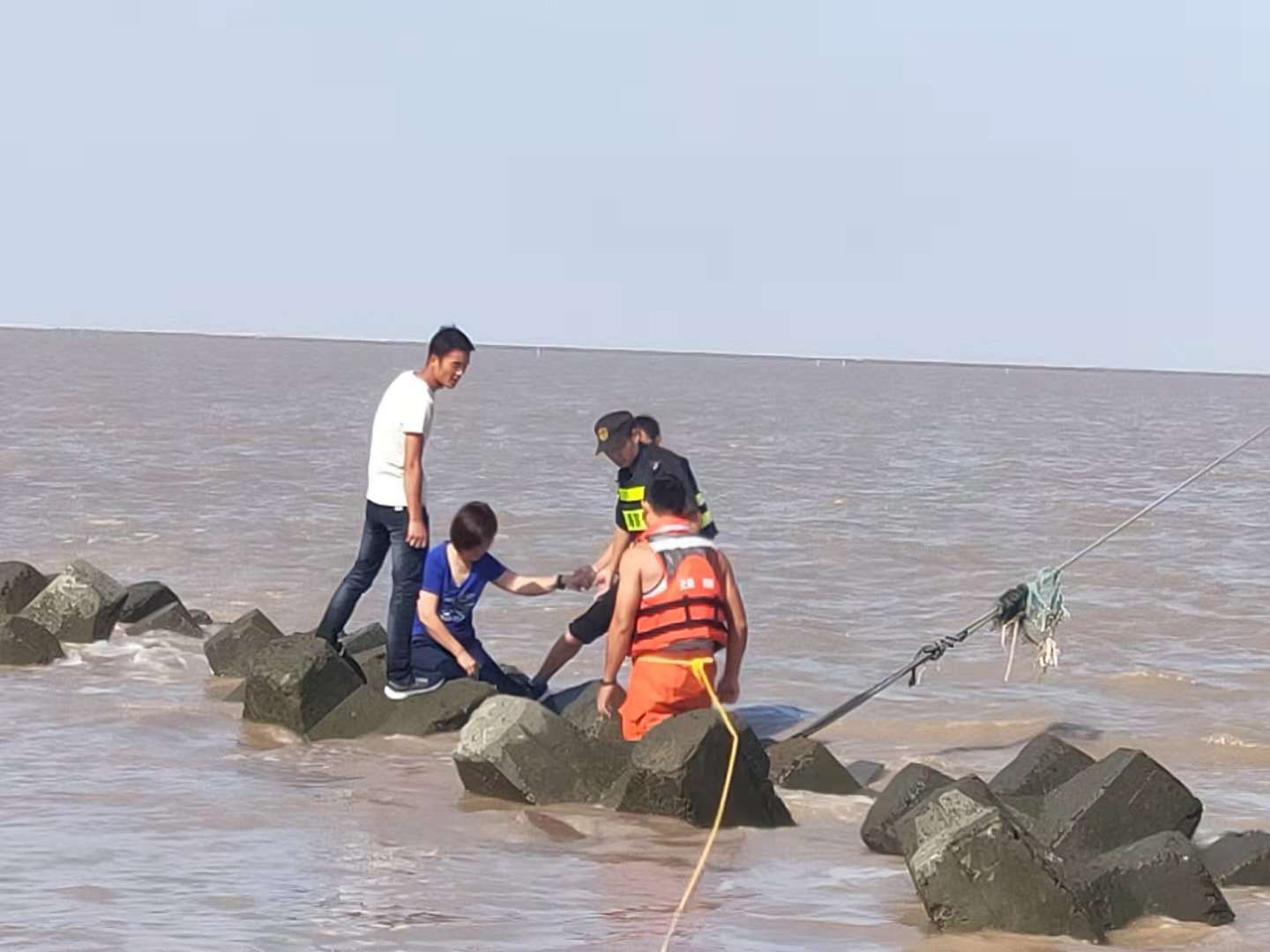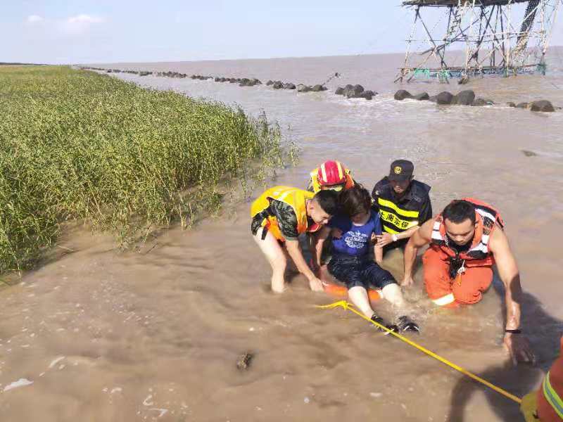 國慶假日,上海臨港,游人如織。海邊的觀(guān)海嘴公園風(fēng)景如畫(huà),更是游樂(lè )的好去處。不少游客不顧提醒、勸阻,擅自翻躍海堤,到海灘上嬉戲。這兩名青年男女甚至到更遠的礁石上玩耍,女游客因腿部扭傷,在漲潮時(shí)無(wú)法及時(shí)撤離,兩人被海水困住了。