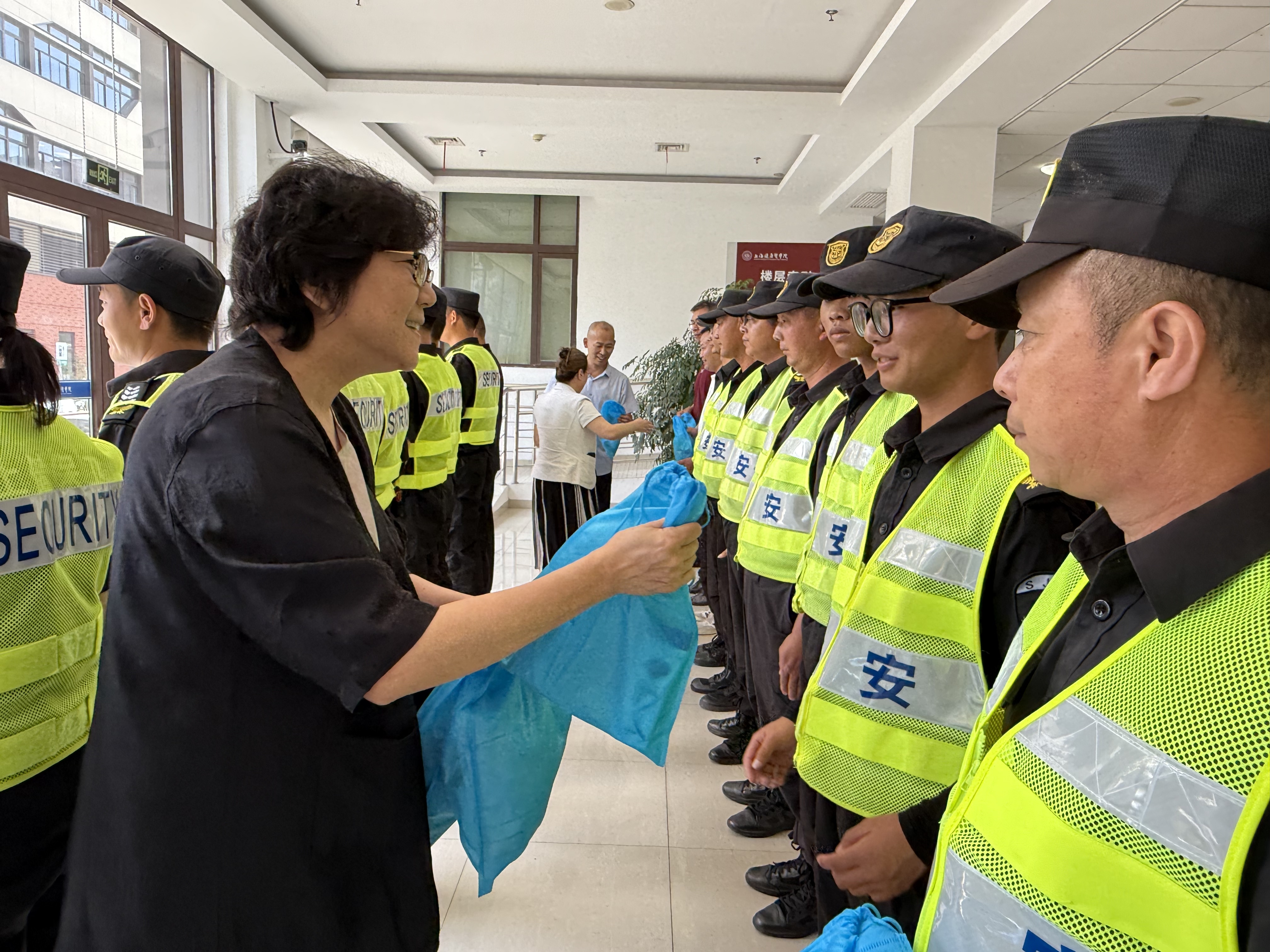 7月10日,上海健康醫學(xué)院黨委書(shū)記郭永瑾一行,看望慰問(wèn)高溫下堅守崗位的宗保公司員工,為他們送上防暑降溫用品,代表醫學(xué)院向公司安保人員致以關(guān)心和問(wèn)候,肯定公司安保人員為維護醫學(xué)院秩序所付出的辛勤勞動(dòng),叮囑大家做好防暑降溫,照顧好自己身體。