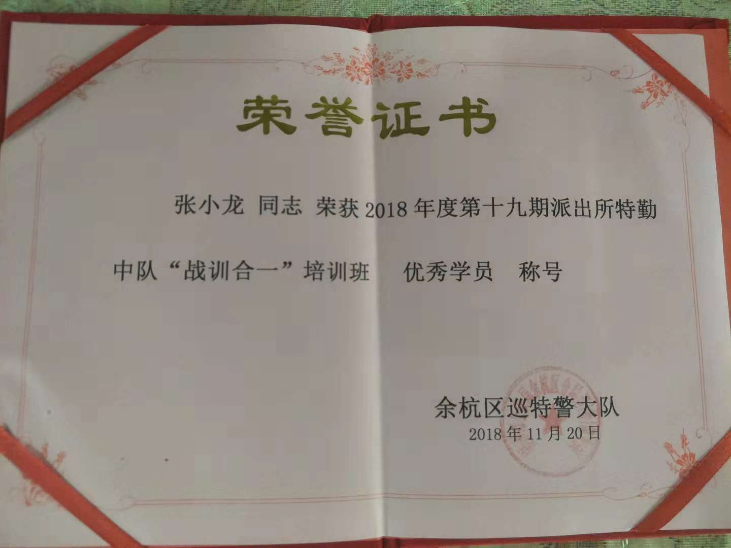 功夫不負有心人,經(jīng)過(guò)嚴格的理論考試和實(shí)戰考核,張小龍和潘森林二位學(xué)員表現尤為突出,榮獲了余杭區巡特警大隊頒發(fā)的榮譽(yù)證書(shū) —— 2018年度第十九期派出所特勤中隊“戰訓合一”培訓班優(yōu)秀學(xué)員稱(chēng)號。