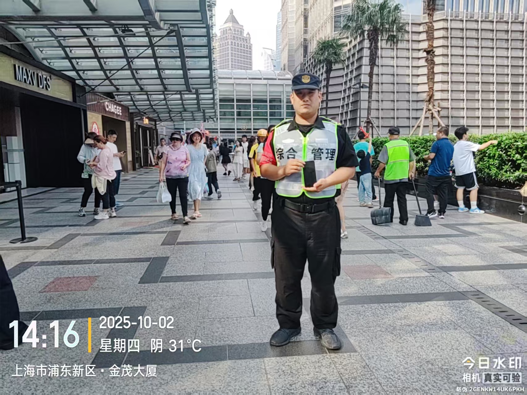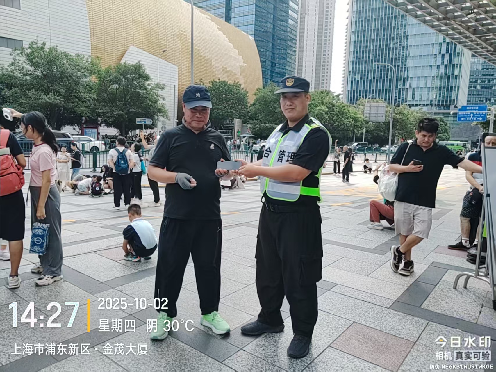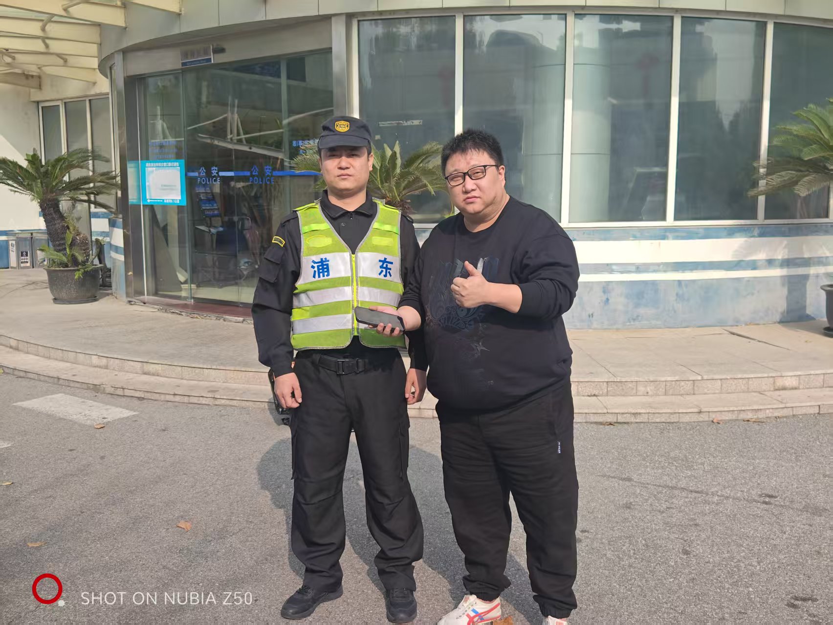 10月2日14:16,宗保公司駐浦東新區南碼頭市容項目員工馬星啟在金茂大廈4號門(mén)口附近值勤時(shí),撿到一部黑色Vivo手機。馬星啟想失主可能會(huì )返回尋找,于是便在原地等待。