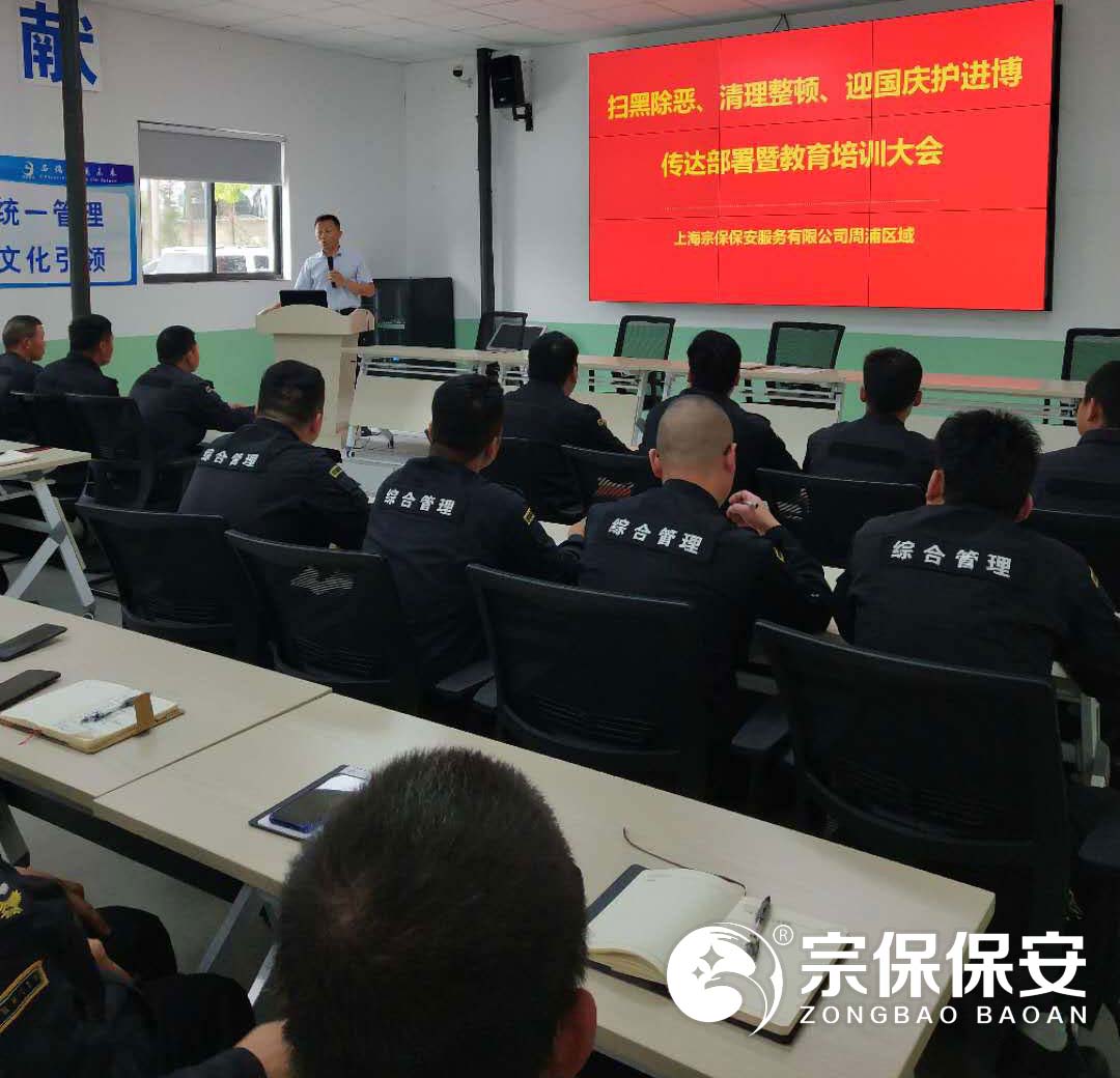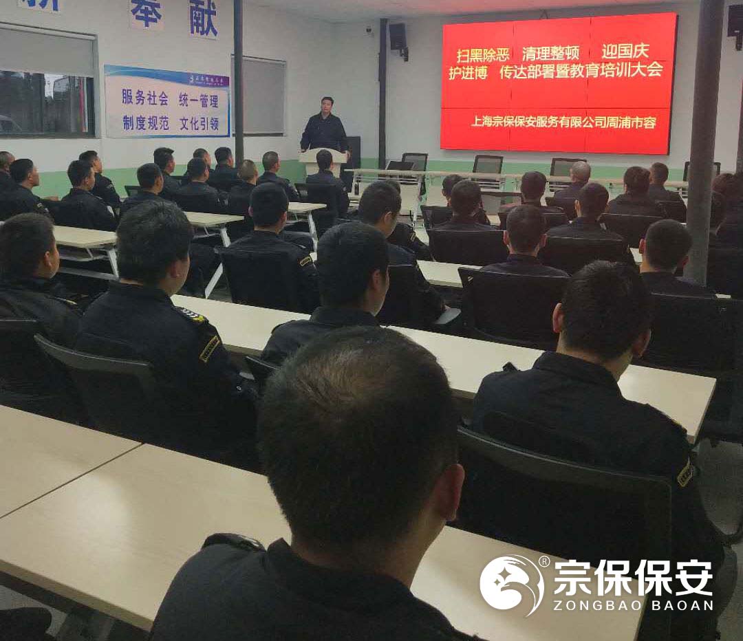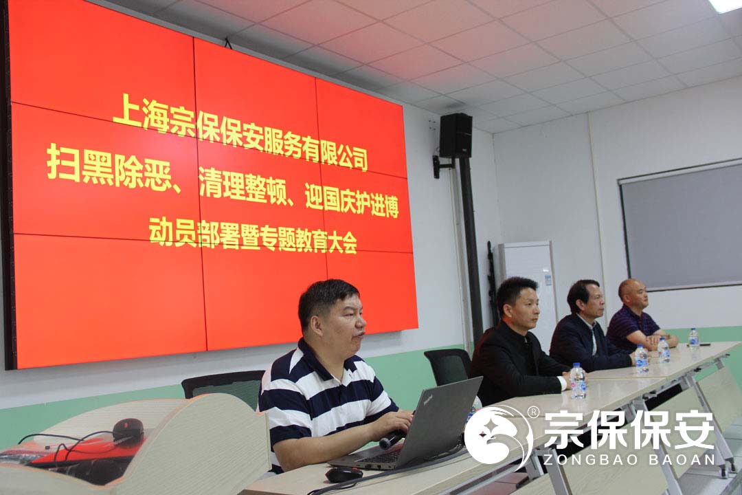 為了全面深入貫徹落實(shí)市治安總隊掃黑除惡專(zhuān)項斗爭工作部署,2019年5月18日上午,上海宗保保安服務(wù)有限公司在申江南路基地召開(kāi)掃黑除惡、清理整治、迎國慶護進(jìn)博動(dòng)員部署暨專(zhuān)題教育大會(huì ),公司項目負責人以上人員全員參加會(huì )議。