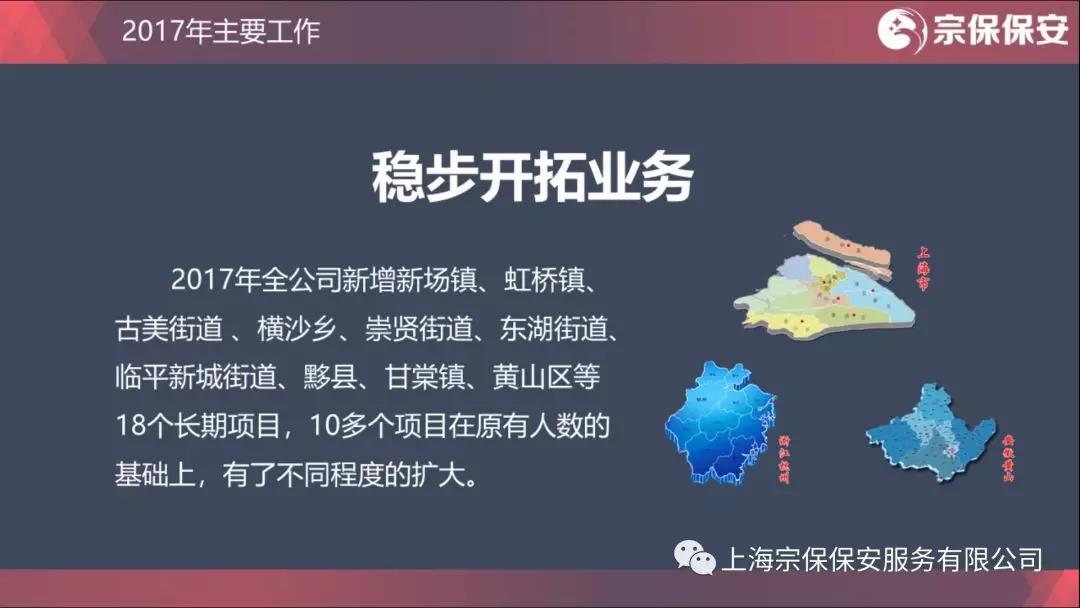 2017年全公司新增新場(chǎng)鎮、虹橋鎮、古美街道 、橫沙鄉、崇賢街道、東湖街道、臨平新城街道、黟縣、甘棠鎮、黃山區等18個(gè)長(cháng)期項目,10多個(gè)項目在原有人數的基礎上,有了不同程度的擴大。2017年公司合同人數增加1000多人。這是公司連續第9年業(yè)績(jì)穩步增長(cháng),年年邁大步、年年上臺階。公司人數的增加,不是簡(jiǎn)單數量上的增長(cháng),而是一批批隊員的合格、一位位骨干的成熟、一個(gè)個(gè)項目的過(guò)硬。