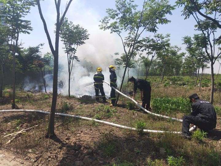 5月19日上午,宗保公司駐書(shū)院市容項目朱新雨、李興忠兩名隊員巡邏至五尺溝西路路段,發(fā)現道路一側樹(shù)林著(zhù)火,火勢很大,濃煙滾滾。周邊都是樹(shù)林,火勢一旦蔓延,后果不堪設想。兩名隊員急忙撥打119火警電話(huà)報警,并向項目副隊長(cháng)石健報告現場(chǎng)情況。石健隨即安排人員到現場(chǎng),疏導道路交通,做好現場(chǎng)安全保障。
