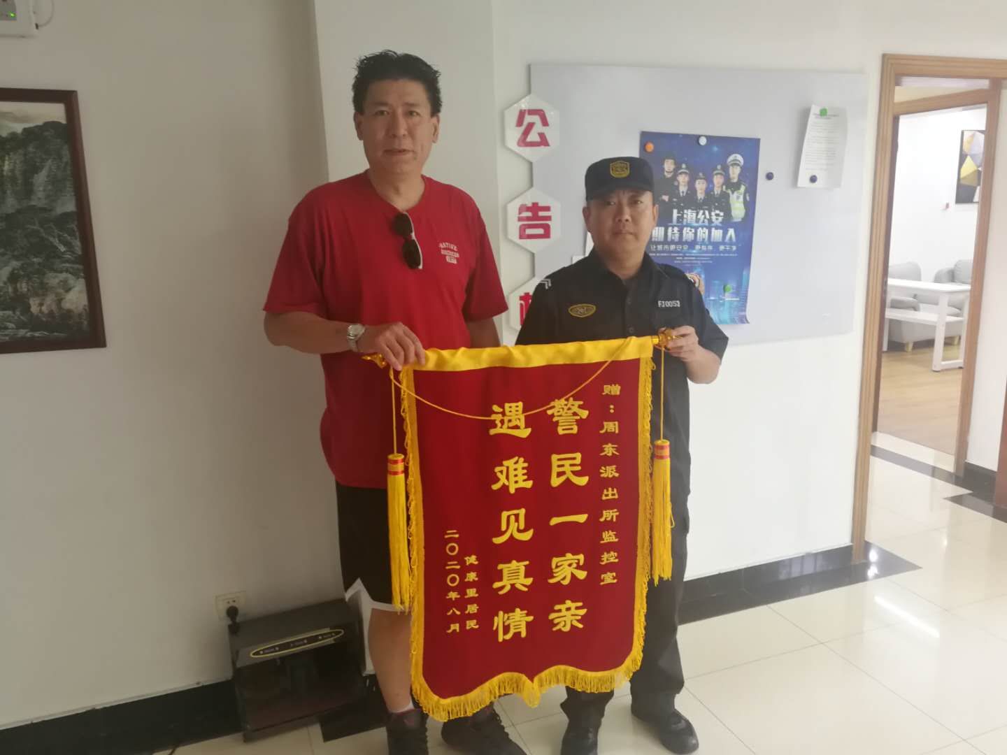 8月7日,一位男士將一面繡著(zhù)“警民一家親,遇難見(jiàn)真情”的錦旗送到了周東派出所,感謝派出所監控室幫助他找到丟失的錢(qián)包。
