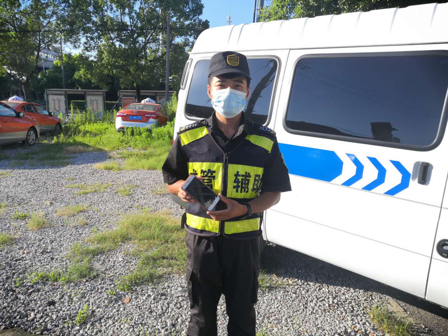 8月15日16:00左右,周浦市容隊員李彥兵和李斌完成疫情防控境外入滬人員接送任務(wù)后,在集中隔離點(diǎn)進(jìn)行消毒時(shí)撿到一部手機。