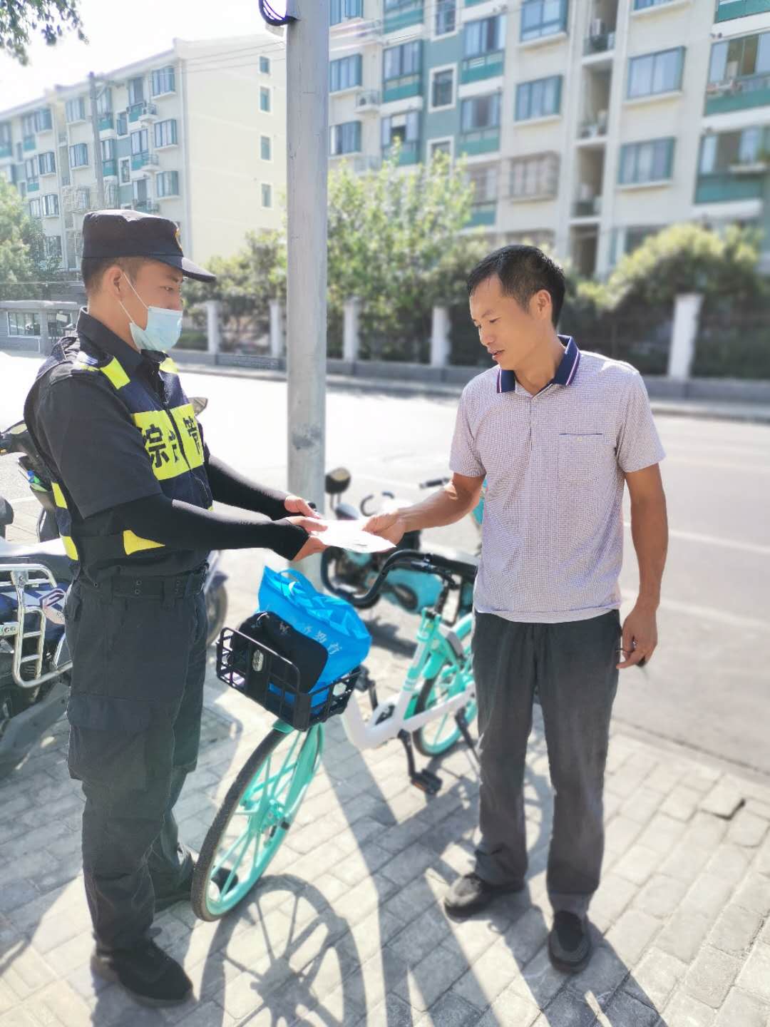 8月20日9:00左右,宗保公司駐三林城管輔助隊員李斌在板泉路980號門(mén)口整理共享單車(chē)時(shí),發(fā)現一輛車(chē)籃子里放著(zhù)一個(gè)文件袋,里面裝有一份購車(chē)合同、身份證、銀行卡和房門(mén)鑰匙等物品。