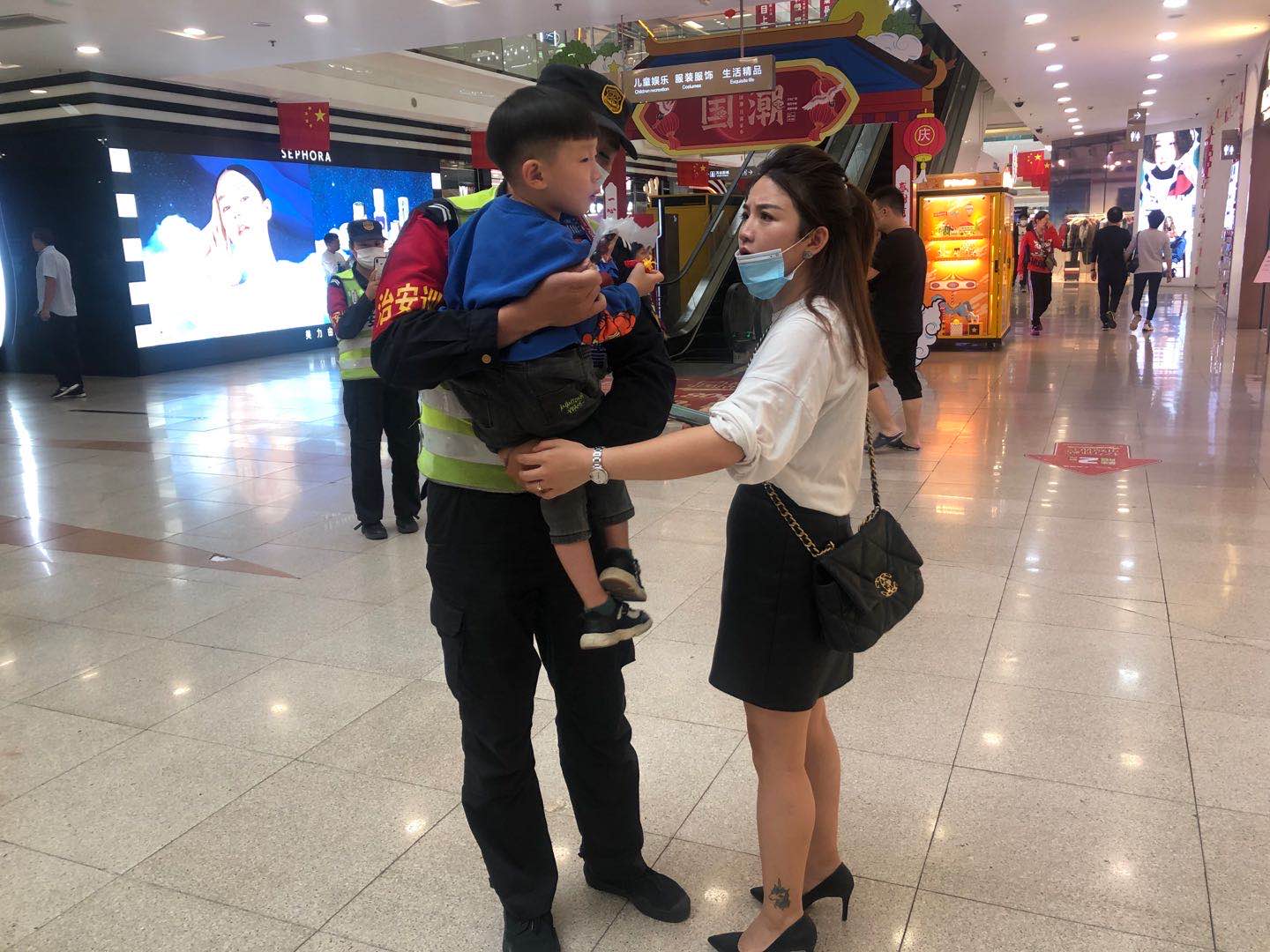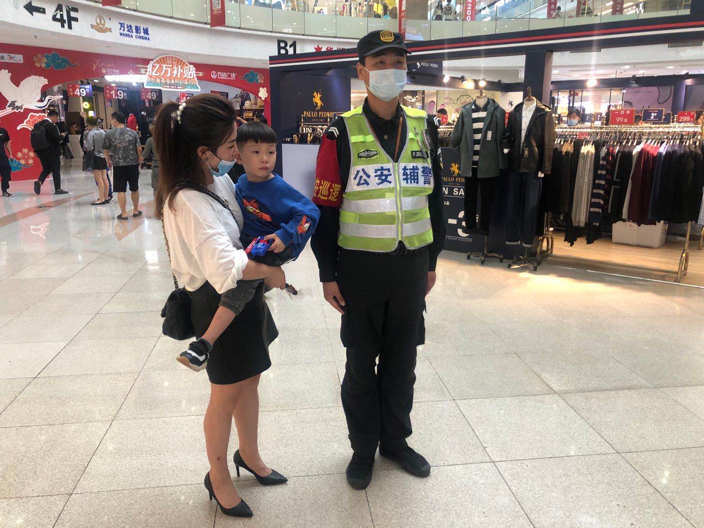 隊員立即將情況報告組長(cháng),并將小朋友帶往萬(wàn)達服務(wù)臺。12:19,在服務(wù)臺碰到正在尋找孩子的媽媽?zhuān)瓉?lái)兩人從美食街東側進(jìn)萬(wàn)達D門(mén),孩子媽媽只顧著(zhù)玩手機,抬頭一看發(fā)現孩子已經(jīng)不在身邊了。確認好身份后,隊員將孩子交給媽媽?zhuān)⑻嵝阉⒁饪醋o好孩子以免發(fā)生意外,孩子媽媽非常感謝輔警的幫助。