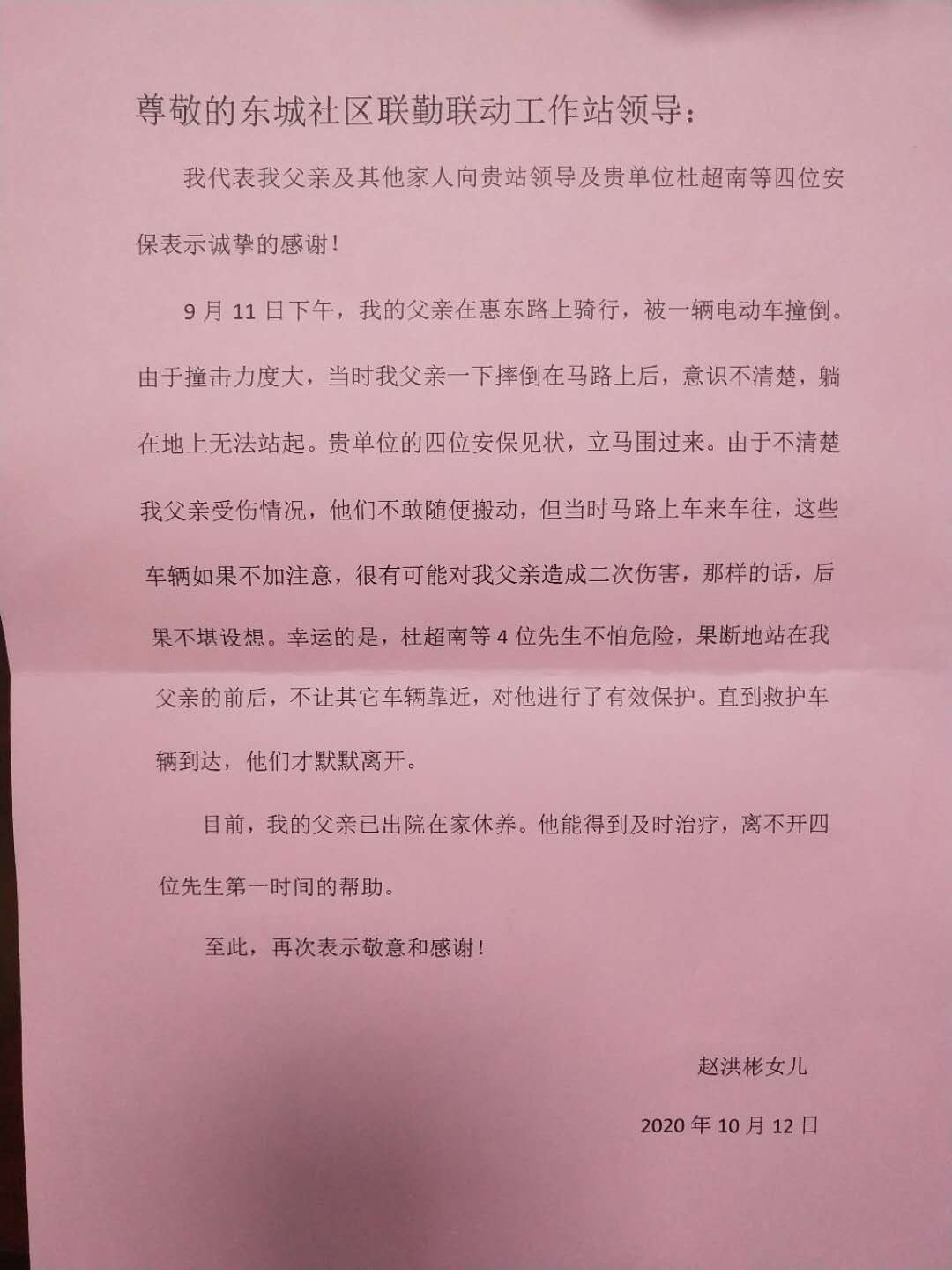事后,老人家屬通過(guò)監控了解到是宗保隊員全力救助了老人, 非常的感動(dòng),特意定制了錦旗,還送來(lái)了感謝信。
