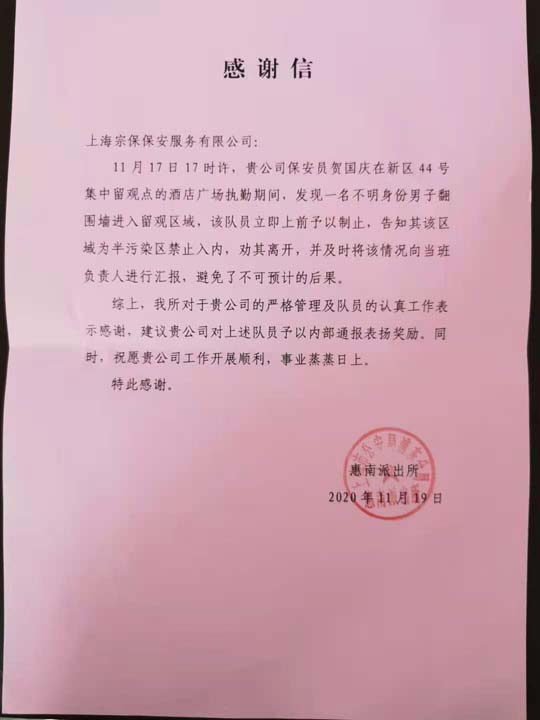 11月19日,浦東新區公安分局惠南派出所副所長(cháng)殷昌建將一封感謝信送到公司駐惠南區域隊員賀國慶手中,對其及時(shí)制止一名男子企圖進(jìn)入隔離區的行為提出表?yè)P。